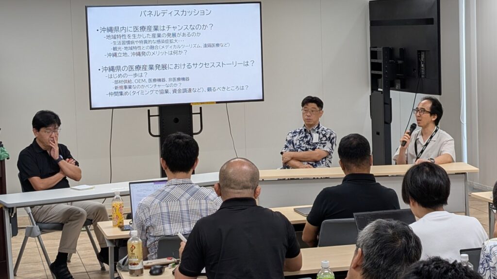 専門科目と特論のライブでの講義とともに、パネルディスカッションでは沖縄での医療産業の可能性について議論しました。また講師や受講生どうしの交流も行われました。